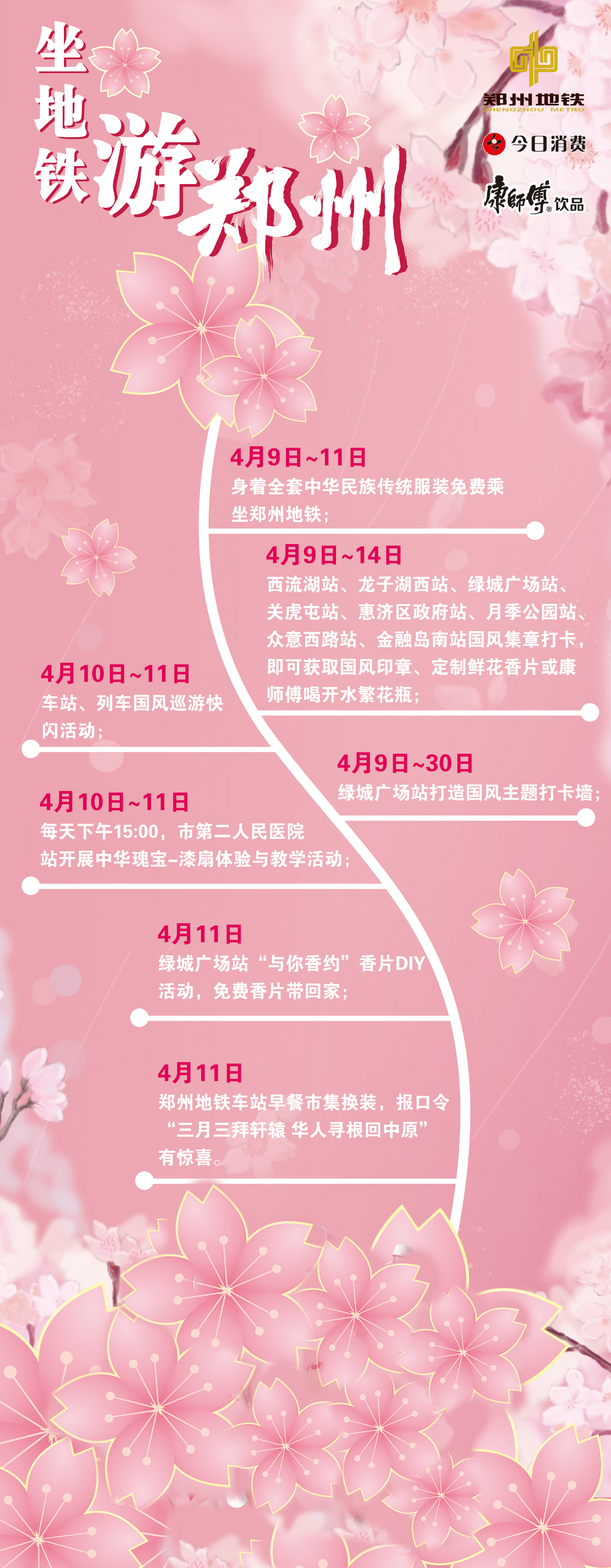 郑州地铁在西流湖站、龙子湖西站、绿城广场站、关虎屯站、惠济区政府站、月季公园站、众意西路站、金融岛南站等8个知名景点、绿色景区主要赏花点周边的地铁车站,开展国风集章打卡活动。